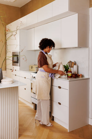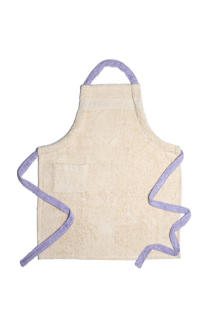 De zachte, verstelbare, lila kleurige riem geeft een speelse en stijlvolle touch aan dit comfortabele, beige schort. Het schort is gemaakt van 100% badstof katoen, waardoor het heerlijk zacht aanvoelt en heel geschikt is voor dagelijks gebruik. Het schort is niet alleen mooi, maar ook functioneel: je kunt snel je handen afvegen aan het schort en de zak biedt genoeg ruimte voor keukengerei of je telefoon. De lila riem is verstelbaar in de nek en taille, zodat het schort altijd perfect om je lichaam zit.