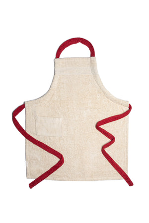 Dit ecru schort met wijnrode, verstelbare band voegt een vleugje kleur en comfort toe aan iedere keuken. Dit comfortabele keukenschort is gemaakt van badstof katoen en zorgt voor een zachte en warme uitstraling. Het schort is ook heel praktisch, omdat het gemakkelijk te wassen is als je het schort als handdoek hebt gebruikt. Zo handig! De wijnrode verstelbare band past zich aan je lichaamsvorm aan, waardoor het altijd goed zit. Met dit schort zit je altijd goed!