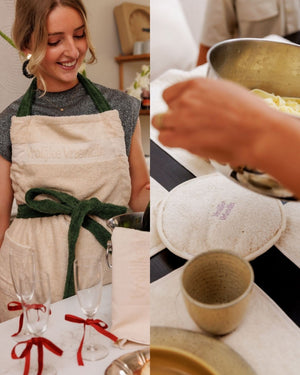 Geef dit kerstseizoen een vleugje warmte en gezelligheid met de Vrolijke Vriendin Kerstdeal: een comfy keukenschort met donkergroene band én een set duurzame pannenlappen van 100% ongebleekt katoen.