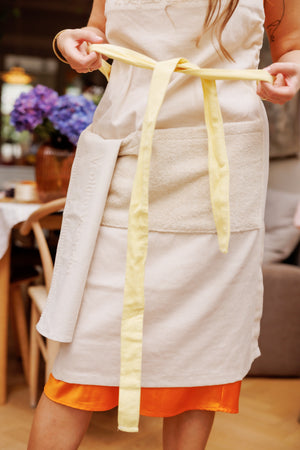 Breng gezelligheid in je keuken met dit praktische beige schort met gele band. Gemaakt van ongebleekt katoen en voorzien van een zachte badstof zak, waar je zo je handen aan af kunt vegen! Het schort heeft een gele, verstelbare nekband en tailleband en zit altijd comfortabel. Zoek je een persoonlijk cadeau? Laat een naam -in het geel- borduren op de zak van het schort. Of het nu voor jezelf is, of als verrassing voor iemand anders: een schort met naam in dezelfde, frisse gele kleur, is ook leuk als praktisch en persoonlijk cadeau!